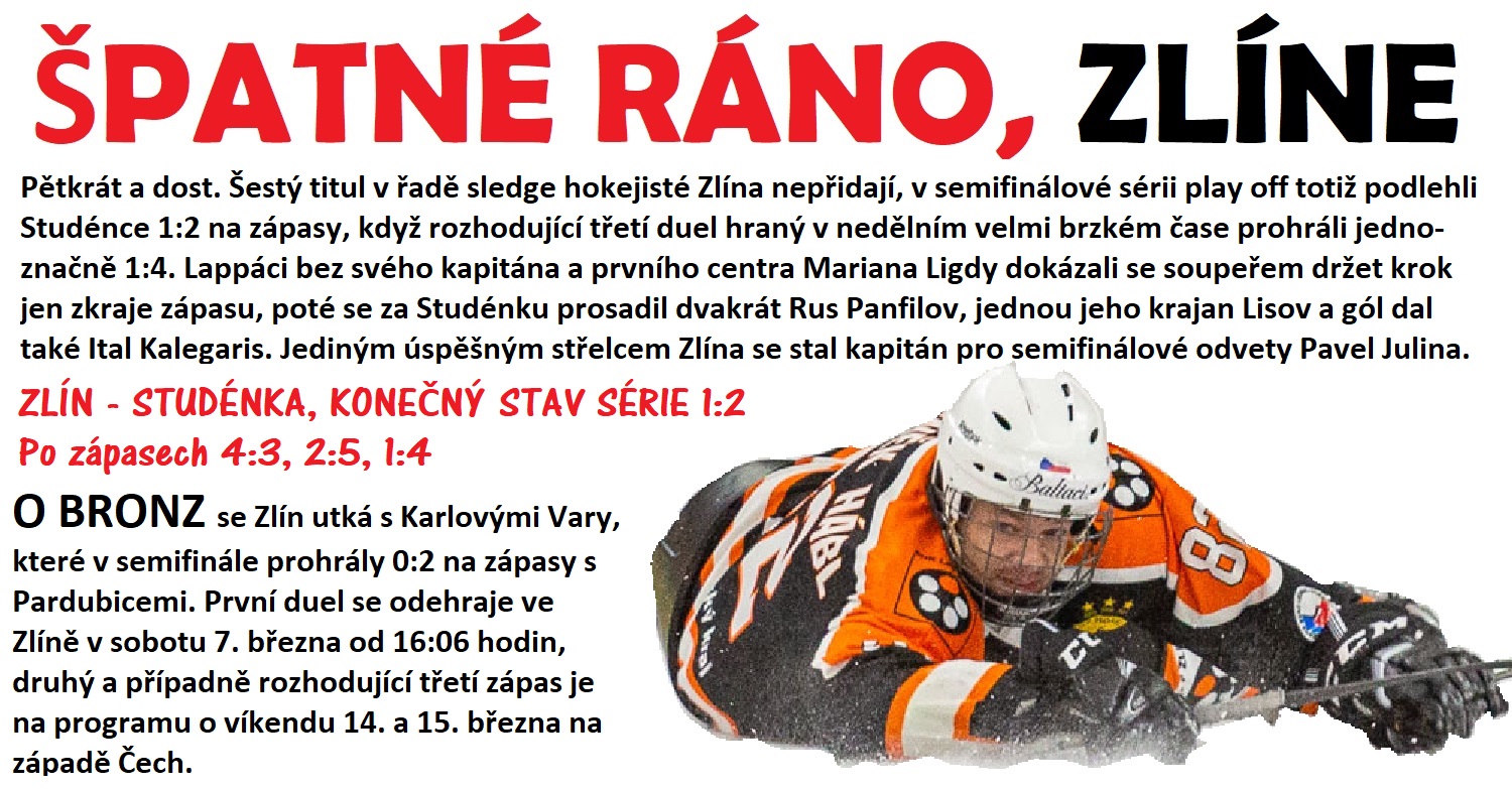 Zlín se v neděli probudil do špatného rána... Je konec, zlatá brána se zavírá. Sledge hokejisté Zlína prohráli rozhodující třetí utkání semifinálové série play off a je jasné, že šestý titul v řadě nepřidají. V nedělním ránu se soupeři ze Studénky vyrovnali jen zkraje utkání a prohráli jasně 1:4. V sérii o bronz se Lappáci utkají s Karlovými Vary, které padly s Pardubicemi 0:2 na zápasy.