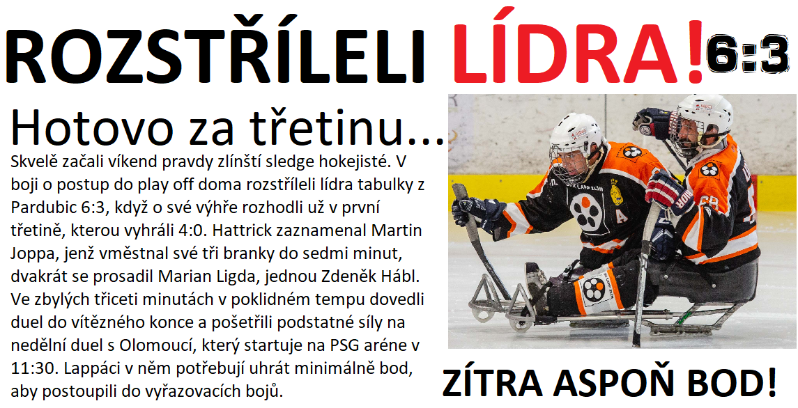 Bravo! Sledge hokejisté velmi suverénně přerušili sérii čtyř porážek v řadě, když na domácím ledě přehráli lídra tabulky z Pardubic jednoznačně 6:3. Pohodovou výhru Lappáci obstarali už v první třetině, kterou vyhráli 4:0. Hattrick zaznamenal Martin Joppa, jenž své zásahy vměstnal do rozmezí sedmi minut. O dva góly se postaral kapitán Ligda, jednu vstřelil Zdeněk Hábl. Zlín čeká v neděli od 11:30 hodin domácí rozhodující duel o účast v play off, v přímém souboji vyzve v závěrečném kole základní části Olomouc. Ta dnes vyhrála ve Studénce 2:1 po samostatných nájezdech, Lappáci tak ze zítřejšího duelu potřebují uhrát minimálně bod. Vstup je zdarma, přijďte fandit!